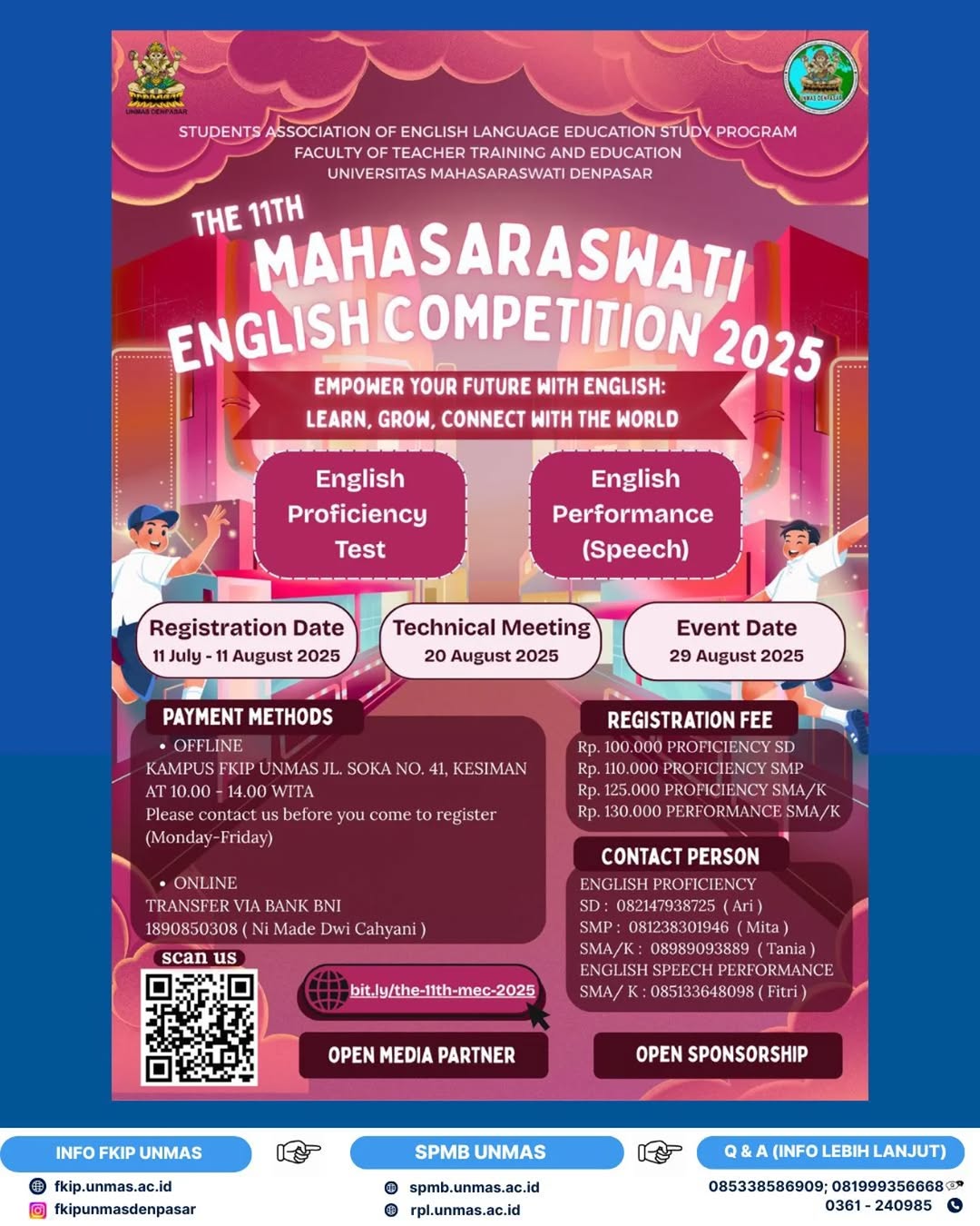 Students Association of English Language Education Study Program, Faculty of Teacher Training and Education, Universitas Mahasaraswati Denpasar proudly presents βThe 11th Mahasaraswati English Competition 2025β.