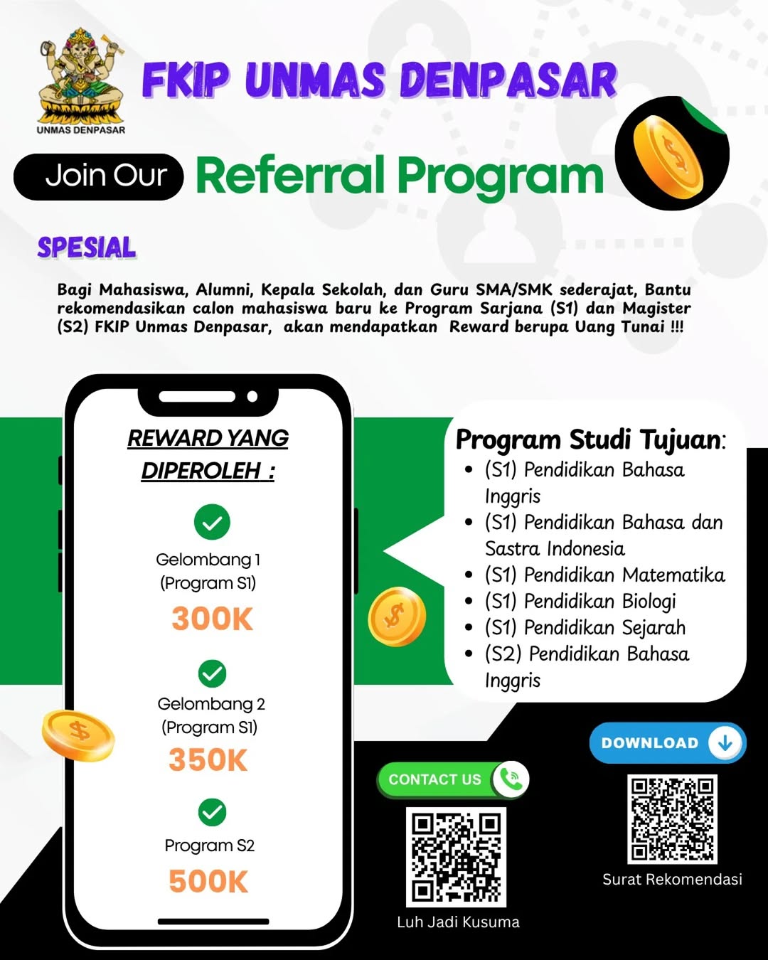 Cukup rekomendasikan teman, siswa, atau kerabat untuk kuliah di Prodi S1 atau S2 FKIP Unmas Denpasar β dan dapatkan reward menarik dari kami! β¨