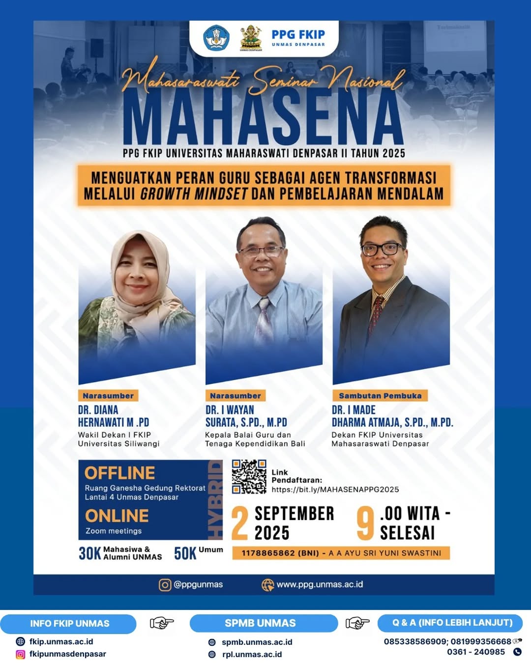 ✨ Prodi Pendidikan Profesi Guru (PPG) FKIP Universitas Mahasaraswati Denpasar dengan bangga menyelenggarakan Mahasaraswati Seminar Nasional (MAHASENA) II 2025 dengan tema: Menguatkan Peran Guru sebagai Agen Transformasi melalui Growth Mindset dan Pembelajaran Mendalam.