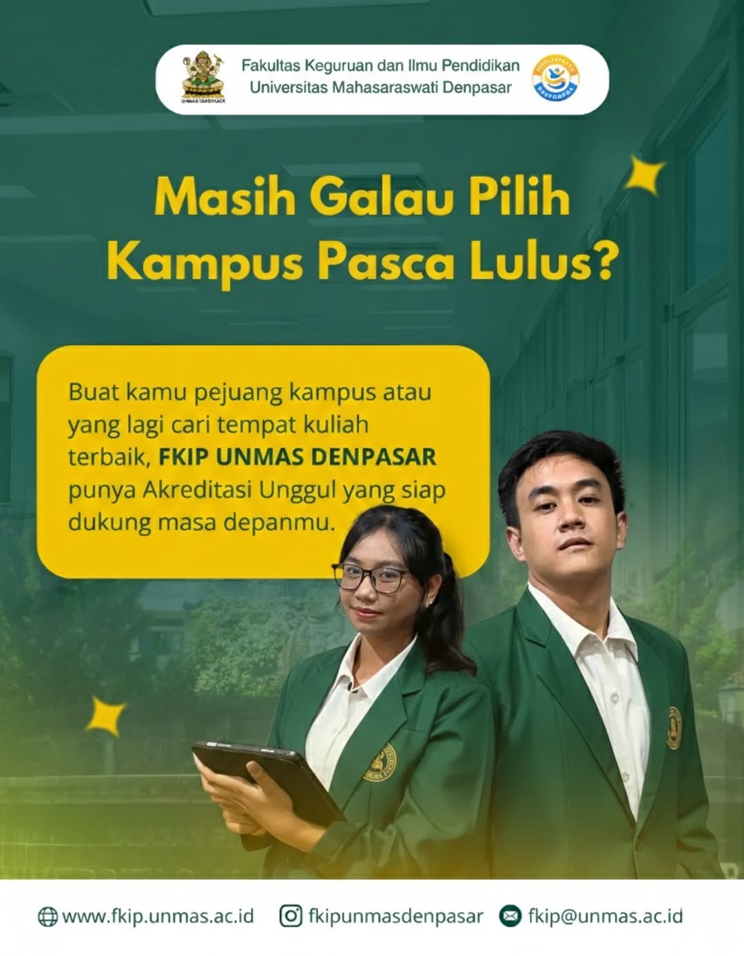Denpasar, 12 Desember 2024 – Seleksi Jegeg Bagus FKIP Unmas Denpasar Tahun 2024 telah usai. Ni Wayan Karunia Fridayanti dan Mohammad Alurso Aranta terpilih sebagai Jegeg dan Bagus FKIP Unmas Denpasar 2024. Keduanya akan mewakili FKIP Unmas Denpasar dalam ajang pemilihan Jegeg Bagus Unmas Denpasar Tahun 2025.