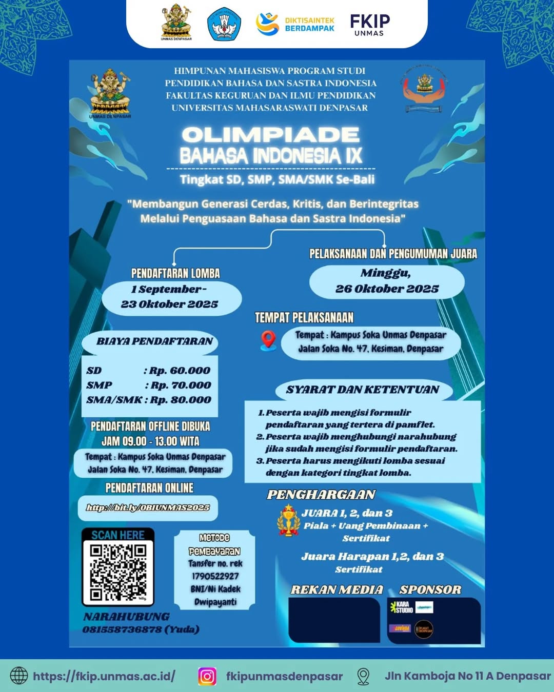 Halo adik-adik tingkat SD, SMP, SMA/SMK seluruh Bali, kabar baik untuk kalian semua, Himpunan Mahasiswa Program Studi Pendidikan Bahasa dan Sastra Indonesia FKIP Unmas Denpasar kembali mempersembahkan “ Olimpiade Bahasa Indonesia Ke-IX 2025 “